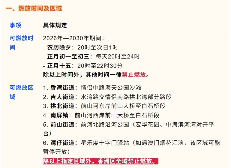 日前,珠海市香洲区应急管理局公布《关于划定珠海市香洲区禁止和限制燃放烟花爆竹区域的通告》,明确2026年至2030年期间烟花爆竹燃放管理规则,划定指定时间、地点允许燃放,其余时段及区域全面禁止。